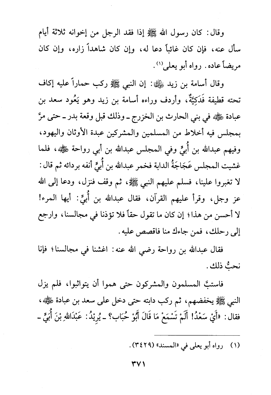 وقال أسامة بن زيد - رضي الله عنهما -: إن النبي - صلى الله عليه وسلم - ركب حماراً عليه إكاف تحته قطيفة فَدَكِيَّةٌ، وأردف وراءه أسامة بن زيد وهو يَعُود سعد بن عبادة - رضي الله عنه - في بني الحارث بن الخزرج - وذلك قبل وقعة بدر - حتى مرَّ بمجلس فيه أخلاط من المسلمين والمشركين عبدة الأوثان واليهود، وفيهم عبد الله بن أُبي وفي المجلس عبد الله بن أبي رواحة - رضي الله عنه -، فلما غشيت المجلس عَجَاجَةُ الدابة فخمر عبد الله بن أُبي أنفه بردائه ثم قال: لا تغبروا علينا، فسلم عليهم النبي - صلى الله عليه وسلم -، ثم وقف فنزل، ودعا إلى الله عز وجل، وقرأ عليهم القرآن، فقال عبد الله بن أُبيٍّ: أيها المرء! لا أحسن من هذا؛ إن كان ما تقول حقاً فلا تؤذنا في مجالسنا، وارجع إلى رحلك، فمن جاءك منا فاقصص عليه.