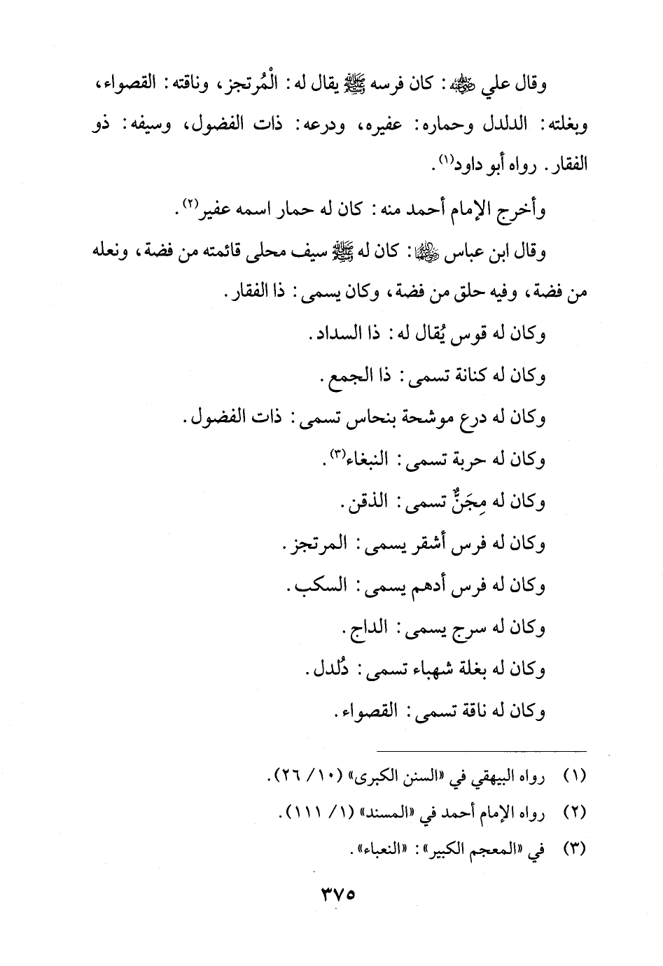 وقال علي - رضي الله عنه -: كان فرسه - صلى الله عليه وسلم - يقال له: الْمُرتجز، وناقته: القصواء، وبغلته: الدلدل وحماره: عفيره، ودرعه: ذات الفضول، وسيفه: ذو الفقار. رواه أبو داود (¬1).
