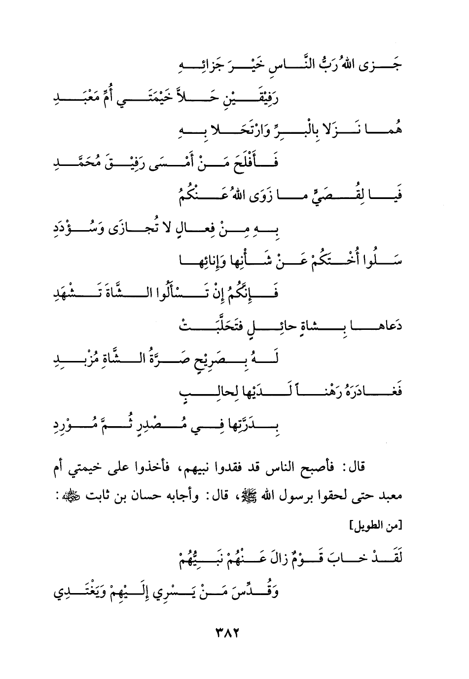 قال: فأصبح الناس قد فقدوا نبيهم، فأخذوا على خيمتي أم معبد حتى لحقوا برسول الله - صلى الله عليه وسلم -، قال: وأجابه حسان بن ثابت - رضي الله عنه -: [من الطويل]