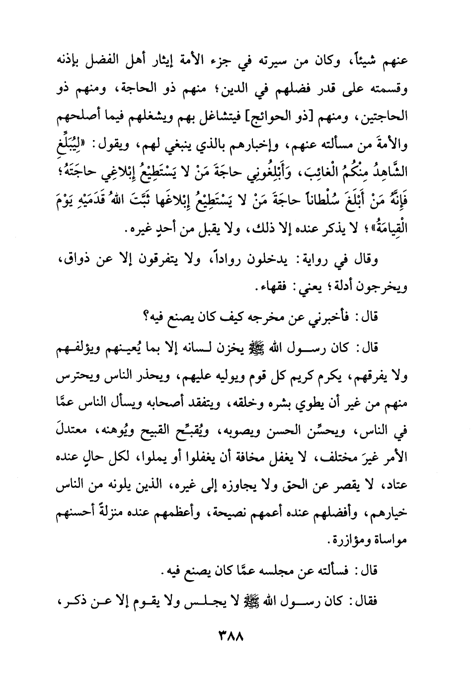 عنهم شيئاً، وكان من سيرته في جزء الأمة إيثار أهل الفضل بإذنه وقسمته على قدر فضلهم في الدين؛ منهم ذو الحاجة، ومنهم ذو الحاجتين، ومنهم أذو الحوائج، فيتشاغل بهم ويشغلهم فيما أصلحهم والأمةَ من مسألته عنهم، وإخبارهم بالذي ينبغي لهم، ويقول: "لِيُبَلِّغِ الشَّاهِدُ مِنْكُمُ الْغائِبَ، وَأَبْلِغُونِي حاجَةَ مَنْ لا يَسْتَطِيع إِبْلاغِي حاجَتَهُ؛ فَإِنَّهُ مَنْ أَبْلَغَ سُلْطاناً حاجَةَ مَنْ لا يَسْتَطِيع إِبْلاغَها ثَبَّتَ اللهُ قَدَمَيْهِ يَوْمَ الْقِيامَةُ"؛ لا يذكر عنده إلا ذلك، ولا يقبل من أحدٍ غيره.