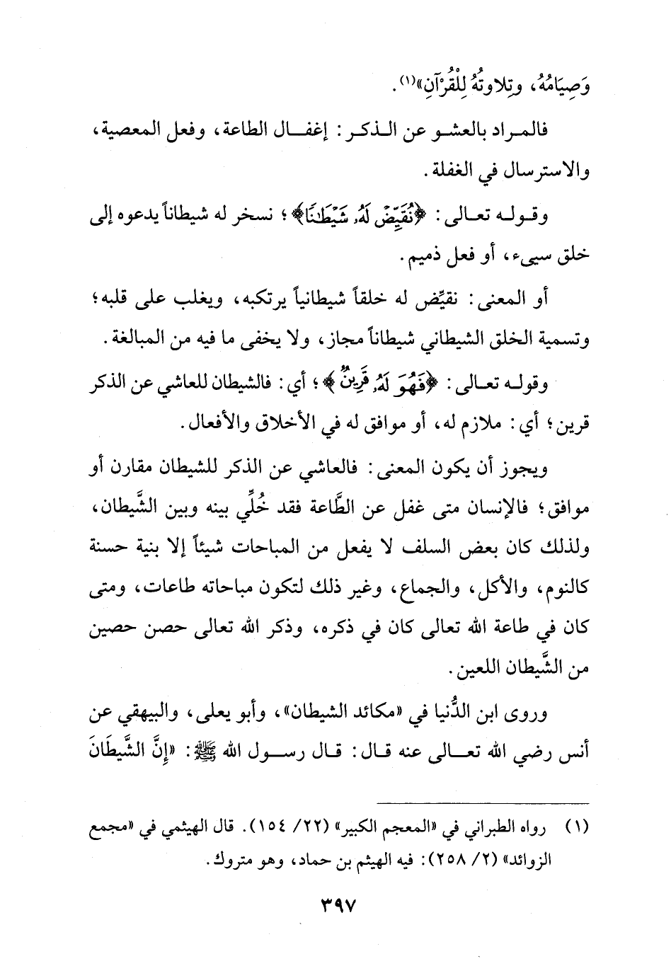 وروى ابن الدُّنيا في "مكائد الشيطان"، وأبو يعلى، والبيهقي عن أنس رضي الله تعالى عنه قال: قال رسول الله - صلى الله عليه وسلم -: "إِنَّ الشَّيطَانَ