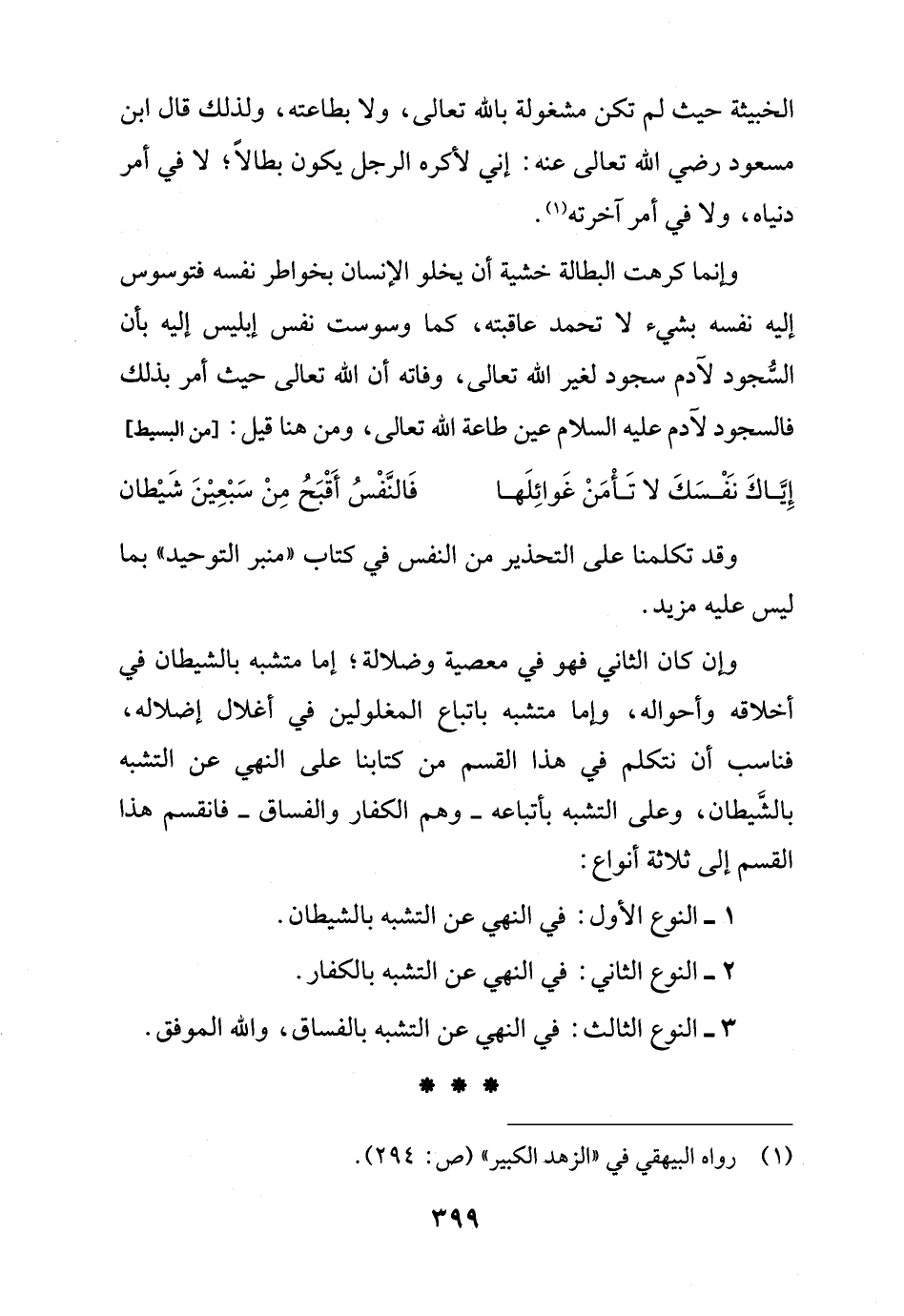 وإن كان الثاني فهو في معصية وضلالة؛ إما متشبه بالشيطان في أخلاقه وأحواله، وإما متشبه باتباع المغلولين فى أغلال إضلاله، فناسب أن نتكلم في هذا القسم من كتابنا على النهي عن التشبه بالشَّيطان، وعلى التشبه بأتباعه - وهم الكفار والفساق - فانقسم هذا القسم إلى ثلاثة أنواع: