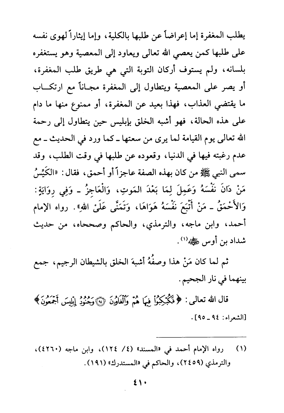 يطلب المغفرة إما إعراضاً عن طلبها بالكلية، وإما إيثاراً لهوى نفسه على طلبها كمن يعصي الله تعالى ويعاود إلى المعصية وهو يستغفره بلسانه، ولم يستوف أركان التوبة التي هي طريق طلب المغفرة، أو يصر على المعصية ويتطاول إلى المغفرة مجاناً مع ارتكاب ما يقتضي العذاب، فهذا بعيد عن المغفرة، أو ممنوع منها ما دام على هذه الحالة، فهو أشبه الخلق بإبليس حين يتطاول إلى رحمة الله تعالى يوم القيامة لما يرى من سعتها - كما ورد في الحديث - مع عدم رغبته فيها في الدنيا، وقعوده عن طلبها في وقت الطلب، وقد سمى النبي - صلى الله عليه وسلم - من كان بهذه الصفة عاجزاً أو أحمق، فقال: "الكَيِّسُ مَنْ دَانَ نَفْسَهُ وَعَمِلَ لِمَا بَعْدَ المَوتِ، وَالْعَاجِزُ - وَفِي رِوَايَةٍ: وَالأَحْمَقُ - مَنْ أتبَعَ نَفْسَهُ هَوَاهَا، وَتَمَنَّى عَلَىْ اللهِ". رواه الإمام أحمد، وابن ماجه، والترمذي، والحاكم وصححاه، من حديث شداد بن أوس - رضي الله عنه - (¬1).