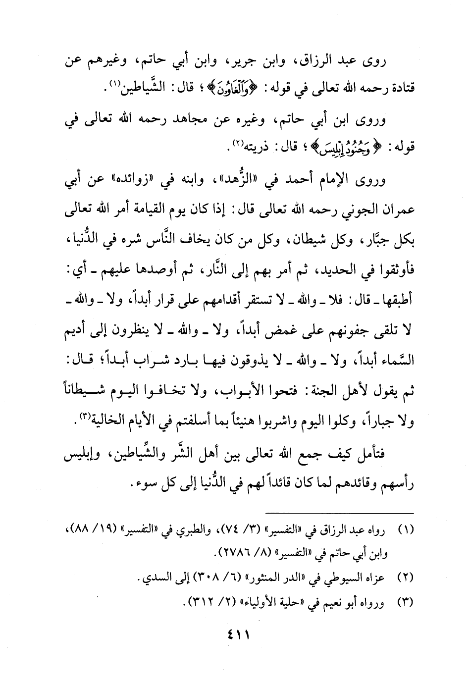 وروى الإمام أحمد في "الزُّهد"، وابنه في "زوائده" عن أبي عمران الجوني رحمه الله تعالى قال: إذا كان يوم القيامة أمر الله تعالى بكل جبَّار، وكل شيطان، وكل من كان يخاف النَّاس شره في الدُّنيا، فأوثقوا في الحديد، ئم أمر بهم إلى النَّار، ثم أوصدها عليهم - أي: أطبقها - قال: فلا - والله - لا تستقر أقدامهم على قرار أبداً، ولا - والله - لا تلقى جفونهم على غمض أبداً، ولا - والله - لا ينظرون إلى أديم السَّماء أبداً، ولا - والله - لا يذوقون فيها بارد شراب أبداً؛ قال: ثم يقول لأهل الجنة: فتحوا الأبواب، ولا تخافوا اليوم شيطاناً ولا جباراً، وكلوا اليوم واشربوا هنيئاً بما أسلفتم في الأيام الخالية (¬3).