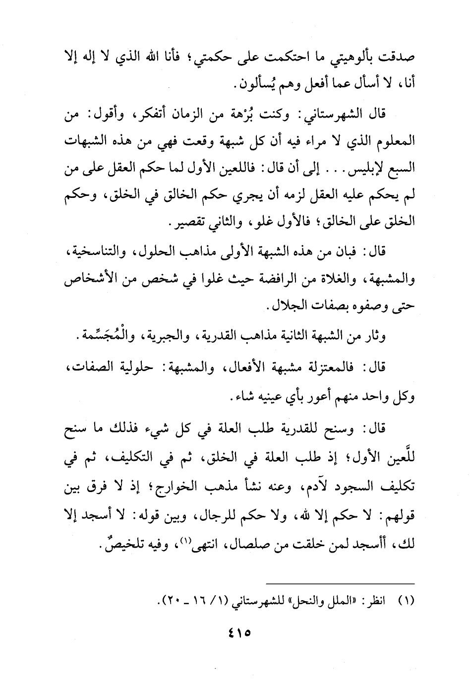 قال الشهرستاني: وكنت بُرْهة من الزمان أتفكر، وأقول: من المعلوم الذي لا مراء فيه أن كل شبهة وقعت فهي من هذه الشبهات السبع لإبليس ... إلى أن قال: فاللعين الأول لما حكم العقل على من لم يحكم عليه العقل لزمه أن يجري حكم الخالق في الخلق، وحكم الخلق على الخالق؛ فالأول غلو، والثاني تقصير.