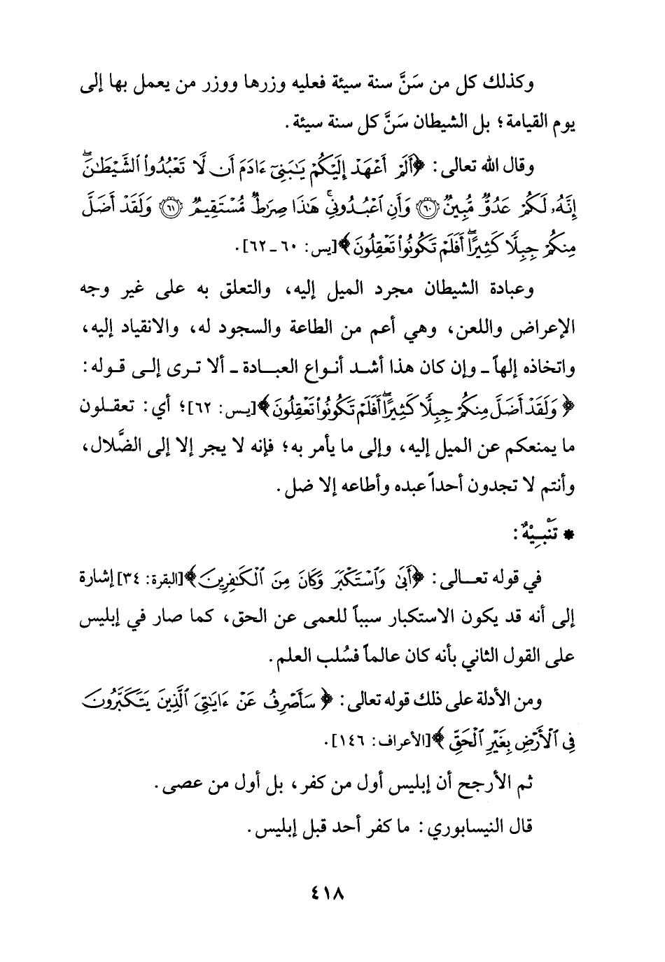 وعبادة الشيطان مجرد الميل إليه، والتعلق به على غير وجه الإعراض واللعن، وهي أعم من الطاعة والسجود له، والانقياد إليه، واتخاذه إلهاً - وإن كان هذا أشد أنواع العبادة - ألا ترى إلى قوله: {وَلَقَدْ أَضَلَّ مِنْكُمْ جِبِلًّا كَثِيرًا أَفَلَمْ تَكُونُوا تَعْقِلُونَ} [يس: 62]؛ أي: تعقلون ما يمنعكم عن الميل إليه، وإلى ما يأمر به؛ فإنه لا يجر إلا إلى الضَّلال، وأنتم لا تجدون أحداً عبده وأطاعه إلا ضل.