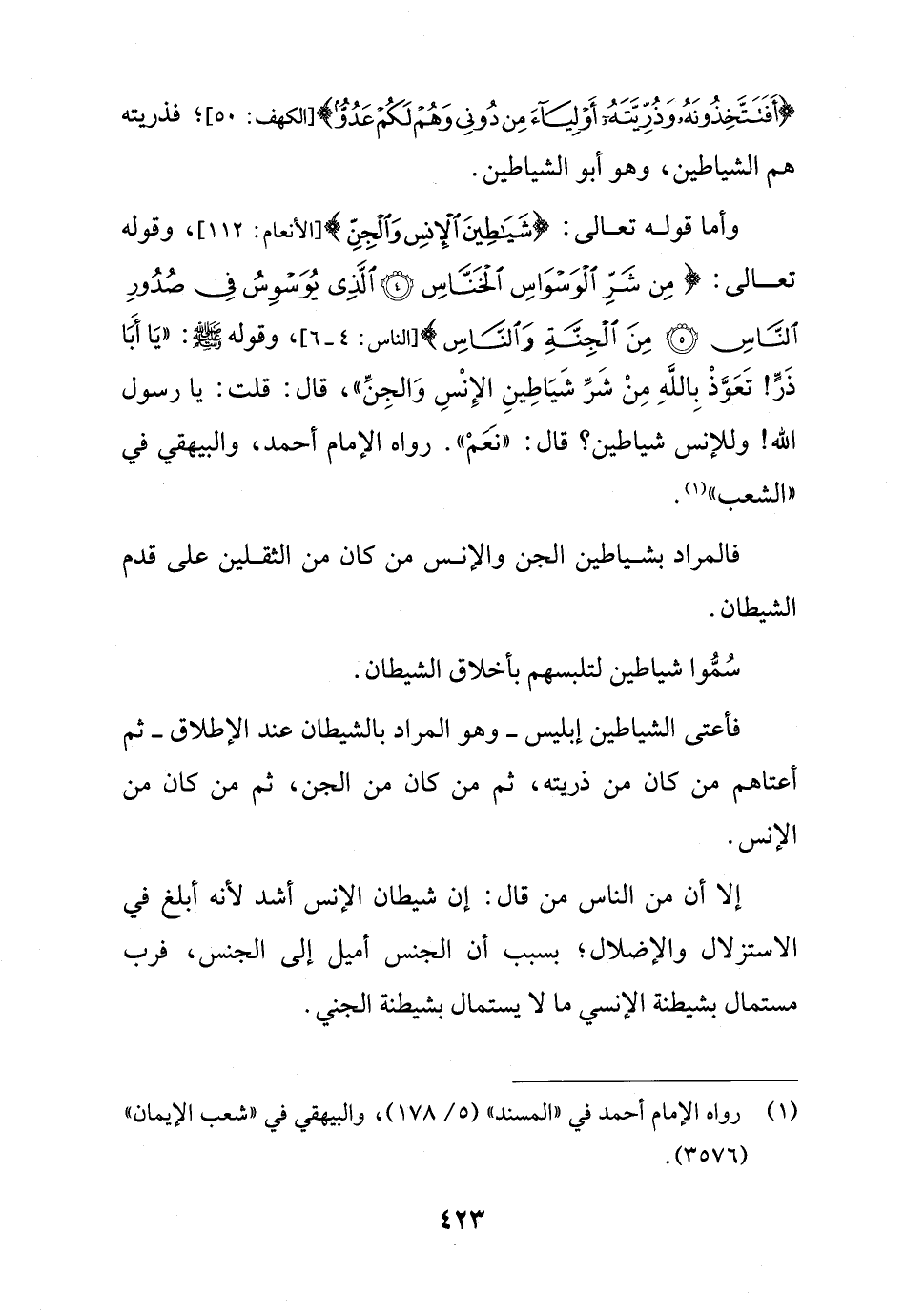 وأما قوله تعالى: {شَيَاطِينَ الْإِنْسِ وَالْجِنِّ} [الأنعام: 112]، وقوله تعالى: {مِنْ شَرِّ الْوَسْوَاسِ الْخَنَّاسِ (4) الَّذِي يُوَسْوِسُ فِي صُدُورِ النَّاسِ (5) مِنَ الْجِنَّةِ وَالنَّاسِ} [الناس: 4 - 6]، وقوله - صلى الله عليه وسلم -: "يَا أَبَا ذَرٍّ! تَعَوَّذْ بِاللَّهِ مِنْ شَرِّ شَيَاطِينِ الإِنْسِ وَالجِنِّ"، قال: قلت: يا رسول الله! وللإنس شياطين؟ قال: "نَعَمْ". رواه الإمام أحمد، والبيهقي في "الشعب" (¬1).