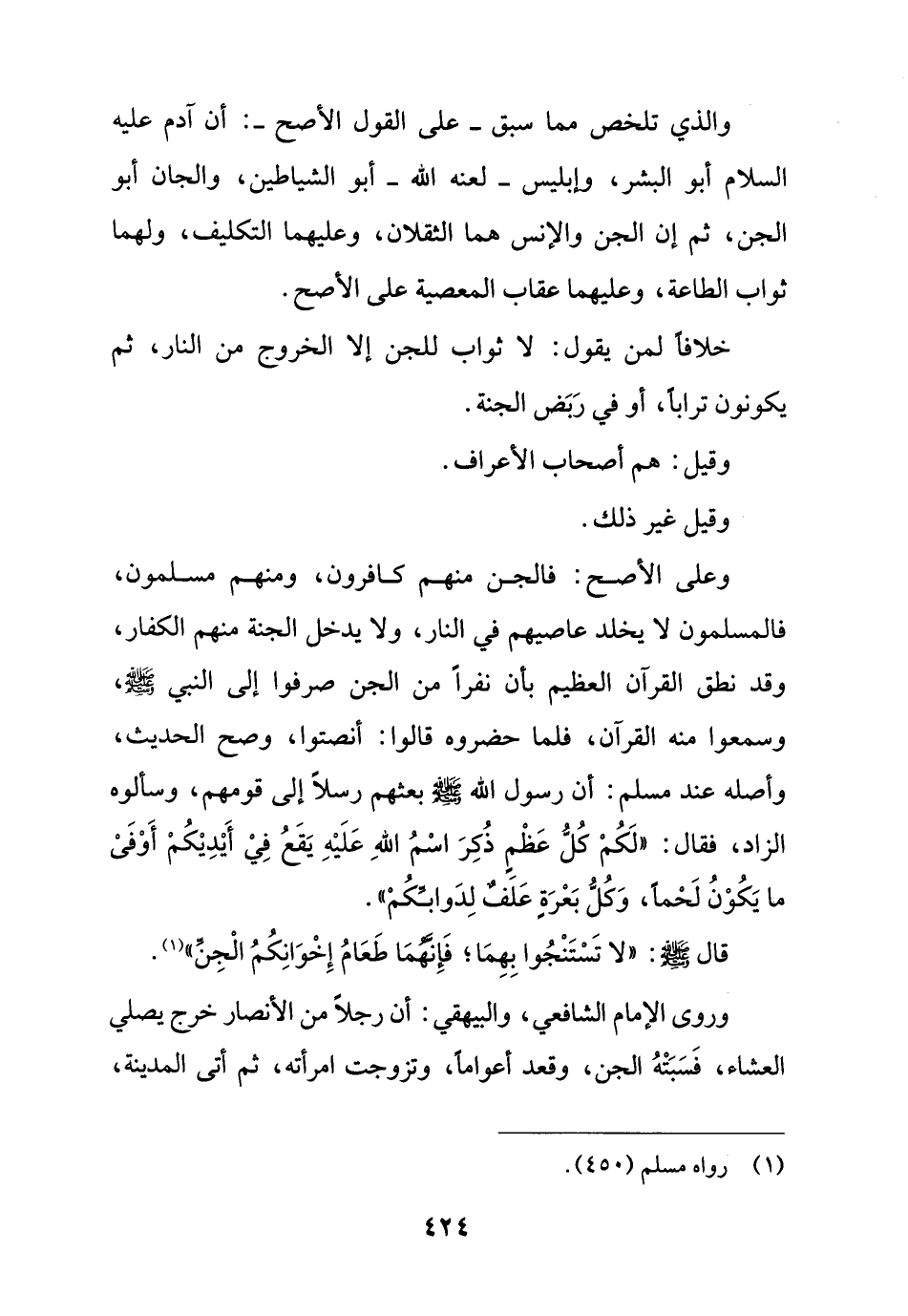 وعلى الأصح: فالجن منهم كافرون، ومنهم مسلمون، فالمسلمون لا يخلد عاصيهم في النار، ولا يدخل الجنة منهم الكفار، وقد نطق القرآن العظيم بأن نفراً من الجن صرفوا إلى النبي - صلى الله عليه وسلم -، وسمعوا منه القرآن، فلما حضروه قالوا: أنصتوا، وصح الحديث، وأصله عند مسلم: أن رسول الله - صلى الله عليه وسلم - بعثهم رسلاً إلى قومهم، وسألوه الزاد، فقال: "لَكُمْ كُلُّ عَظْمٍ ذُكِرَ اسْمُ اللهِ عَلَيْهِ يَقَعُ فِيْ أَيْدِيْكُمْ أَوْفَىْ ما يَكُوْنُ لَحْماً، وَكُلُّ بَعْرَةٍ عَلَفٌ لِدَوابِّكُمْ".