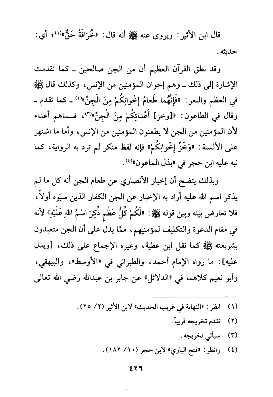 وبذلك يتضح أن إخبار الأنصاري عن طعام الجن أنه كل ما لم يذكر اسم الله عليه أراد به الإخبار عن الجن الكفار الذين سبَوه أولاً، فلا تعارض بينه وبين قوله - صلى الله عليه وسلم -: "لَكُمْ كُلُّ عَظْمٍ ذُكِرَ اسْمُ اللهِ عَلَيْهِ" لأنه في مقام الدعوة والتكليف لمؤمنيهم، ممَّا يدل على أن الجن متعبدون بشريعته - صلى الله عليه وسلم - كما نقل ابن عطية، وغيره الإجماع على ذلك، [ويدل عليه]: ما رواه الإمام أحمد، والطبراني في "الأوسط"، والبيهقي، وأبو نعيم كلاهما في "الدلائل" عن جابر بن عبد الله رضي الله تعالى