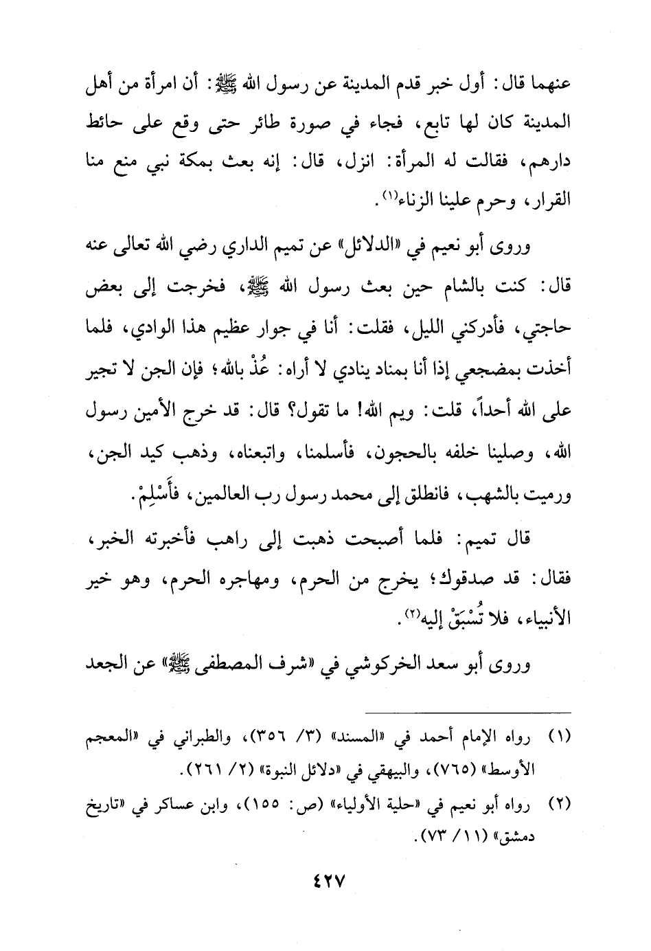 وروى أبو نعيم في "الدلائل" عن تميم الداري رضي الله تعالى عنه قال: كنت بالشام حين بعث رسول الله - صلى الله عليه وسلم -، فخرجت إلى بعض حاجتي، فأدركني الليل، فقلت: أنا في جوار عظيم هذا الوادي، فلما أخذت بمضجعي إذا أنا بمناد ينادي لا أراه: عُذْ بالله؛ فإن الجن لا تجير على الله أحداً، قلت: ويم الله! ما تقول؟ قال: قد خرج الأمين رسول الله، وصلينا خلفه بالحجون، فأسلمنا، واتبعناه، وذهب كيد الجن، ورميت بالشهب، فانطلق إلى محمد رسول رب العالمين، فأَسْلِمْ.