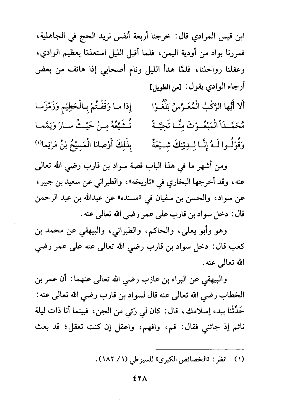 ومن أشهر ما في هذا الباب قصة سواد بن قارب رضي الله تعالى عنه، وقد أخرجها البخاري في "تاريخه" والطبراني عن سعيد بن جبير، عن سواد، والحسن بن سفيان في "مسنده" عن عبد الله بن عبد الرحمن قال: دخل سواد بن قارب على عمر رضي الله تعالى عنه.