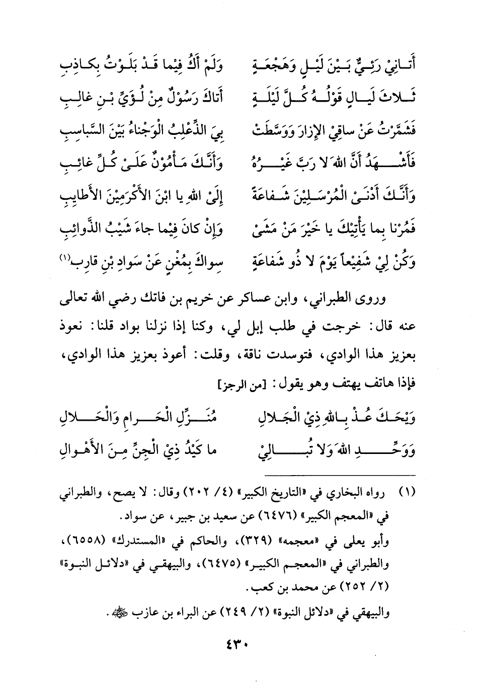 وروى الطبراني، وابن عساكر عن خريم بن فاتك رضي الله تعالى عنه قال: خرجت في طلب إبل لي، وكنا إذا نزلنا بواد قلنا: نعوذ بعزيز هذا الوادي، فتوسدت ناقة، وقلت: أعوذ بعزيز هذا الوادي، فإذا هاتف يهتف وهو يقول: [من الرجز]