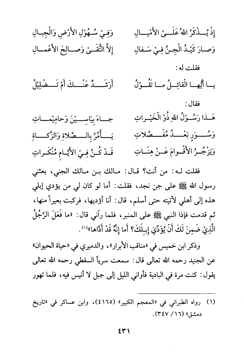 وذكر ابن خميس في "مناقب الأبرار"، والدميري في "حياة الحيوان" عن الجنيد رحمه الله تعالى قال: سمعت سرياً السقطي رحمه الله تعالى يقول: كنت مرة في البادية فأواني الليل إلى جبل لا أنيس فيه، فلما تهور