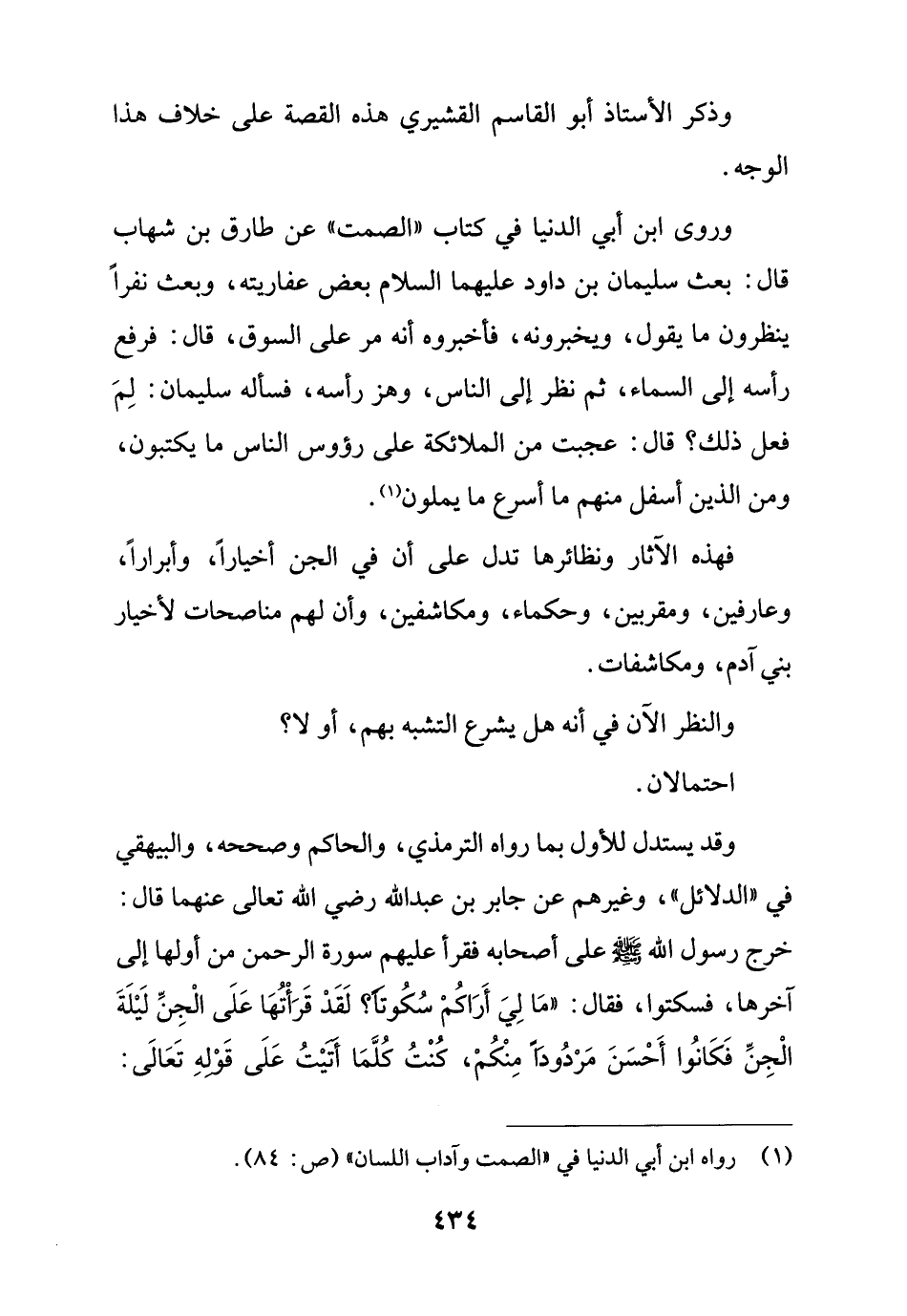 فهذه الآثار ونظائرها تدل على أن في الجن أخياراً، وأبراراً، وعارفين، ومقربين، وحكماء، ومكاشفين، وأن لهم مناصحات لأخيار بني آدم، ومكاشفات.
