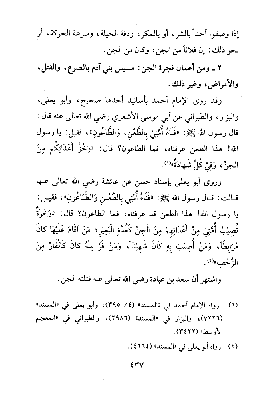 وقد روى الإمام أحمد بأسانيد أحدها صحيح، وأبو يعلى، والبزار، والطبراني عن أبي موسى الأشعري رضي الله تعالى عنه قال: قال رسول الله - صلى الله عليه وسلم -: "فَنَاءُ أُمَّتِيْ بِالطَّعْنِ، وَالطَّاعُونِ"، فقيل: يا رسول الله! هذا الطعن عرفناه، فما الطاعون؟ قال: "وَخْزُ أَعْدَائِكُم مِنَ الجنِّ، وَفِيْ كُلٍّ شَهادَةٌ" (¬1).
