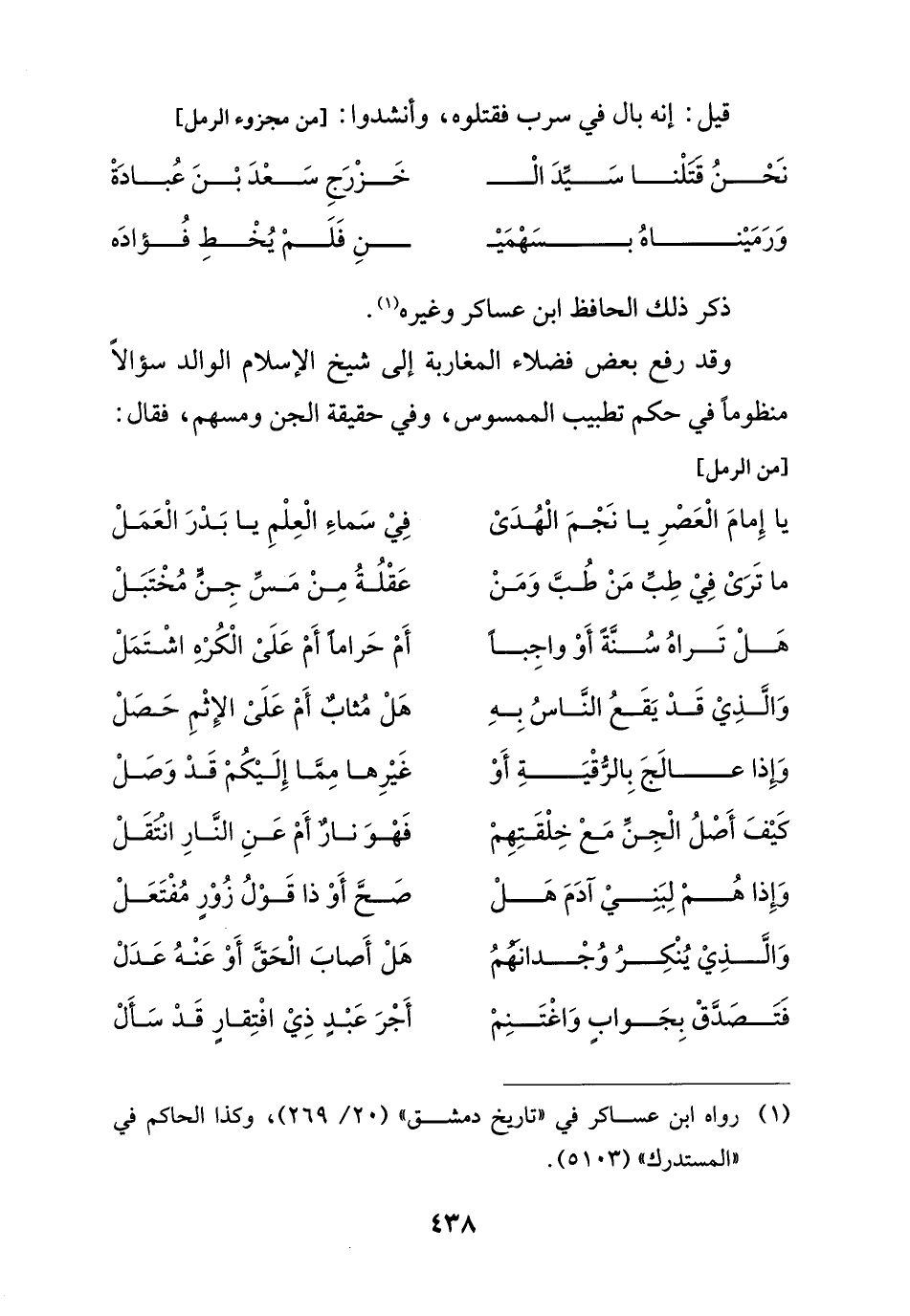 وقد رفع بعض فضلاء المغاربة إلى شيخ الإسلام الوالد سؤالاً منظوماً في حكم تطبيب الممسوس، وفي حقيقة الجن ومسهم، فقال: [من الرمل]