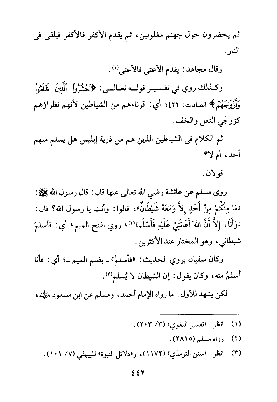 روى مسلم عن عائشة رضي الله تعالى عنها قال: قال رسول الله - صلى الله عليه وسلم -: "مَا مِنْكُمْ مِنْ أَحَدٍ إِلاَّ وَمَعَهُ شَيْطَانٌ"، قالوا: وأنت يا رسول الله؟ قال: "وَأَنَا، إِلاَّ أَنَّ اللهَ أَعَاننَيْ عَلَيْهِ فَأَسْلَم" (¬2)؛ روي بفتح الميم؛ أي: فأسلمَ شيطاني، وهو المختار عند الأكثرين.
