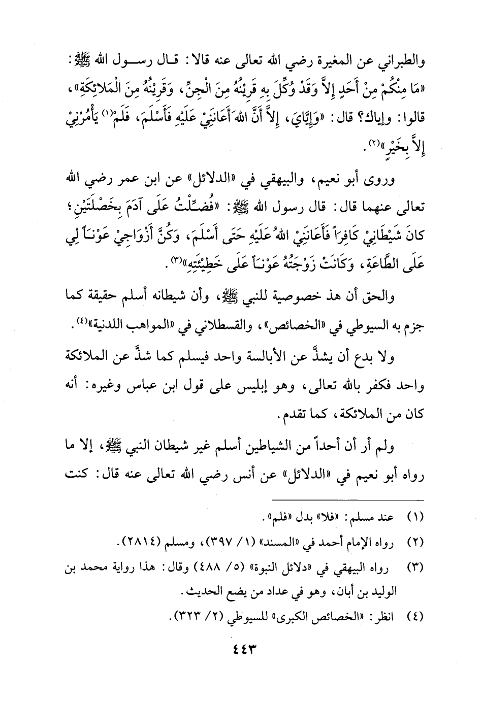 ولم أر أن أحداً من الشياطين أسلم غير شيطان النبي - صلى الله عليه وسلم -، إلا ما رواه أبو نعيم في "الدلائل" عن أنس رضي الله تعالى عنه قال: كنت