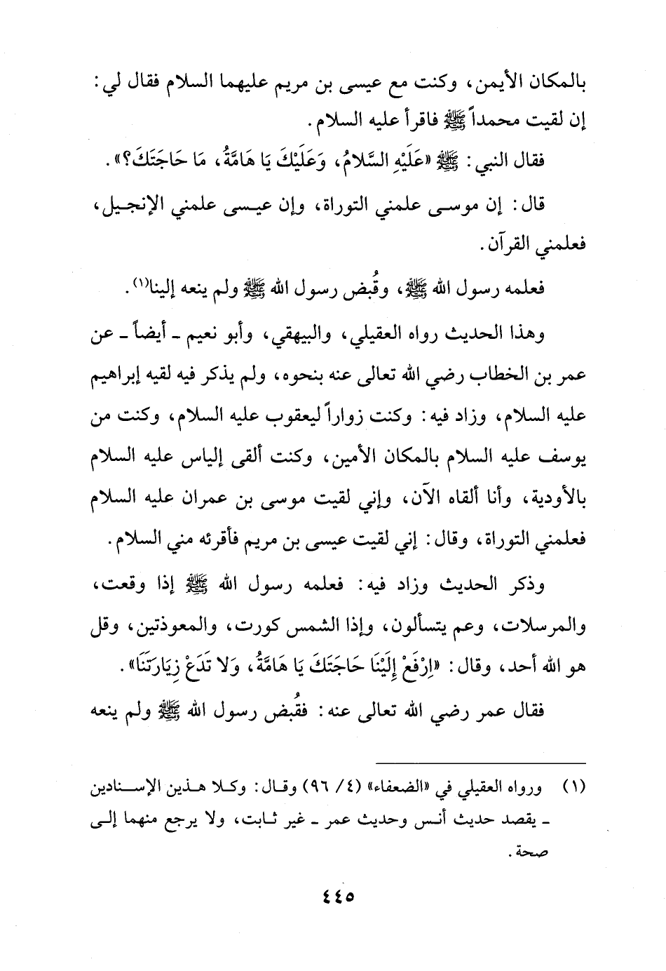 وهذا الحديث رواه العقيلي، والبيهقي، وأبو نعيم - أيضاً - عن عمر بن الخطاب رضي الله تعالى عنه بنحوه، ولم يذكر فيه لقيه إبراهيم عليه السلام، وزاد فيه: وكنت زواراً ليعقوب عليه السلام، وكنت من يوسف عليه السلام بالمكان الأمين، وكنت ألقى إلياس عليه السلام بالأودية، وأنا ألقاه الآن، وإني لقيت موسى بن عمران عليه السلام فعلمني التوراة، وقال: إني لقيت عيسى بن مريم فأقرئه مني السلام.