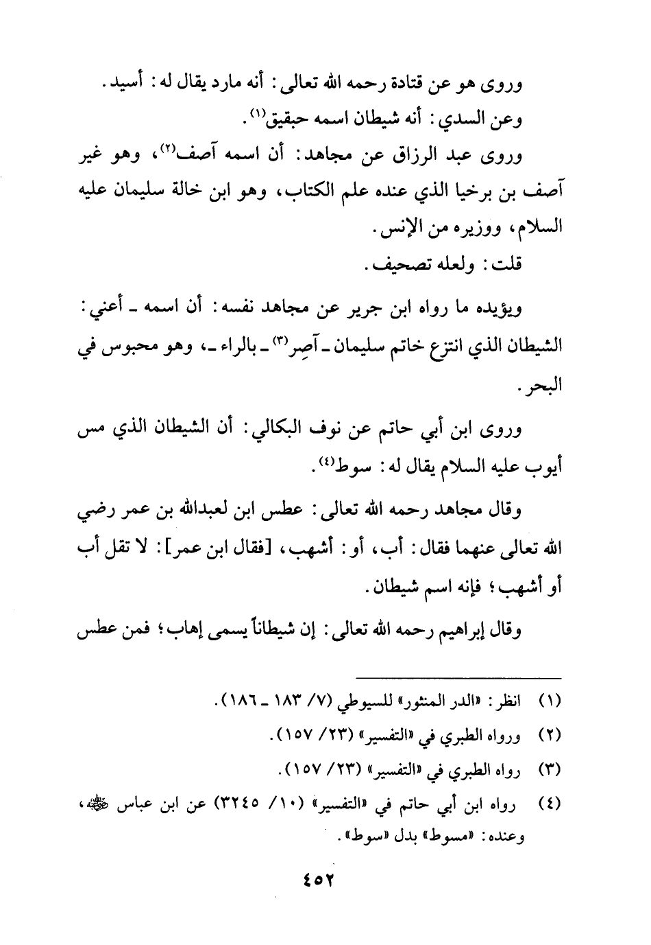 وروى ابن أبي حاتم عن نوف البكالي: أن الشيطان الذي مس أيوب عليه السلام يقال له: سوط (¬4).