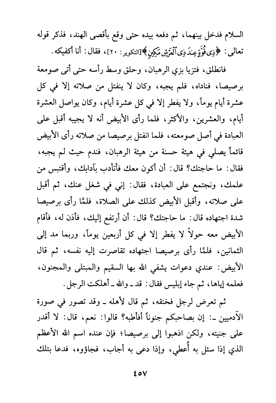 فانطلق، فتزيا بزي الرهبان، وحلق وسط رأسه حتى أتى صومعة برصيصا، فناداه، فلم يجبه، وكان لا ينفتل من صلاته إلا في كل عشرة أيام يوماً، ولا يفطر إلا في كل عشرة أيام، وكان يواصل العشرة أيام، والعشرين، والأكثر، فلما رأى الأبيض أنه لا يجيبه أقبل على العبادة في أصل صومعته، فلما انفتل برصيصا من صلاته رأى الأبيض قائماً يصلي في هيئة حسنة من هيئة الرهبان، فندم حيث لم يجبه، فقال: ما حاجتك؟ قال: أن أكون معك فأتأدب بآدابك، وأقتبس من علمك، ونجتمع على العبادة، فقال: إني في شغل عنك، ثم أقبل على صلاته، وأقبل الأبيض كذلك على الصلاة، فلمَّا رأى برصيصا شدة اجتهاده قال: ما حاجتك؟ قال: أن أرتفع إليك، فأذن له، فأقام الأبيض معه حولاً لا يفطر إلا في كل أربعين يوماً، وربما مد إلى الثمانين، فلمَّا رأى برصيصا اجتهاده تقاصرت إليه نفسه، ثم قال الأبيض: عندي دعوات يشفي الله بها السقيم والمبتلى والمجنون، فعلمه إياها، ثم جاء إبليس فقال: قد - والله - أهلكت الرجل.