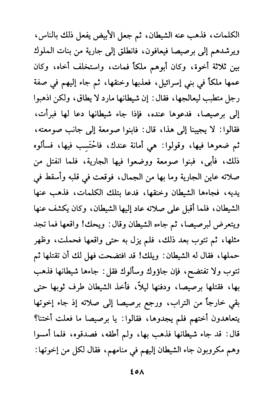الكلمات، فذهب عنه الشيطان، ثم جعل الأبيض يفعل ذلك بالناس، ويرشدهم إلى برصيصا فيعافون، فانطلق إلى جارية من بنات الملوك بين ثلاثة أخوة، وكان أبوهم ملكاً فمات، واستخلف أخاه، وكان عمها ملكاً في بني إسرائيل، فعذبها وخنقها، ثم جاء إليهم في صفة رجل متطبب ليعالجها، فقال: إن شيطانها مارد لا يطاق، ولكن اذهبوا إلى برصيصا، فدعوها عنده، فإذا جاء شيطانها دعا لها فبرأت، فقالوا: لا يجيبنا إلى هذا، قال: فابنوا صومعة إلى جانب صومعته، ثم ضعوها فيها، وقولوا: هي أمانة عندك، فاحْتَسِب فيها، فسألوه ذلك، فأبى، فبنوا صومعة ووضعوا فيها الجارية، فلما انفتل من صلاته عاين الجارية وما بها من الجمال، فوقعت في قلبه وأسقط في يديه، فجاءها الشيطان وخنقها، فدعا بتلك الكلمات، فذهب عنها الشيطان، فلما أقبل على صلاته عاد إليها الشيطان، وكان يكشف عنها ويتعرض لبرصيصا، ثم جاءه الشيطان وقال: ويحك! واقعها فما تجد مثلها، ثم تتوب بعد ذلك، فلم يزل به حتى واقعها فحملت، وظهر حملها، فقال له الشيطان: ويلك! قد افتضحت فهل لك أن تقتلها ثم تتوب ولا تفتضح، فإن جاؤوك وسألوك فقل: جاءها شيطانها فذهب بها، فقتلها برصيصا، ودفنها ليلاً، فأخذ الشيطان طرف ثوبها حتى بقي خارجاً من التراب، ورجع برصيصا إلى صلاته إذ جاء إخوتها يتعاهدون أختهم فلم يجدوها، فقالوا: يا برصيصا ما فعلت أختنا؟ قال: قد جاء شيطانها فذهب بها، ولم أطقه، فصدقوه، فلما أمسوا وهم مكروبون جاء الشيطان إليهم في منامهم، فقال لكل من إخوتها:
