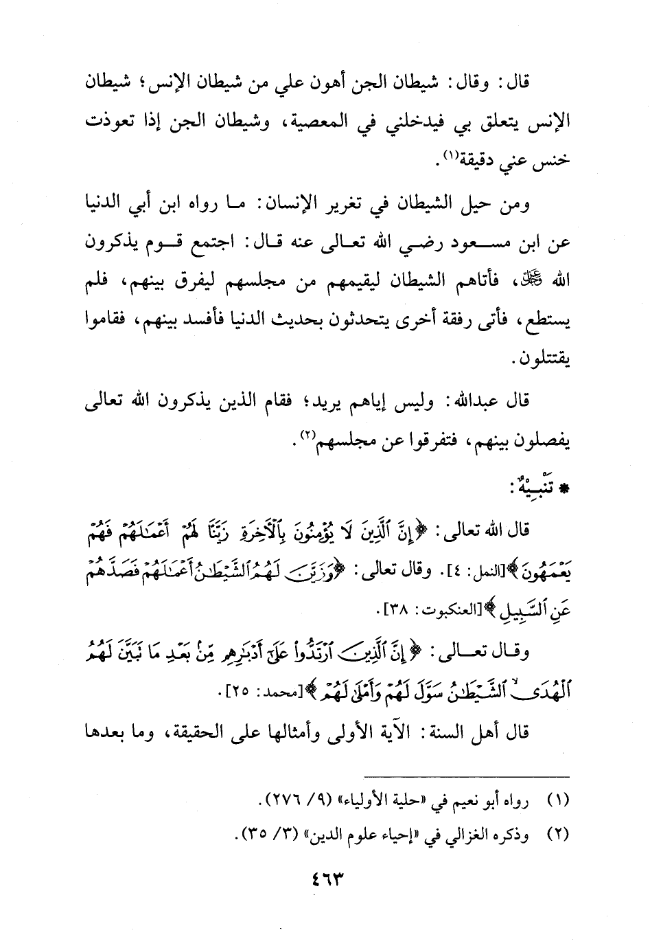 ومن حيل الشيطان في تغرير الإنسان: ما رواه ابن أبي الدنيا عن ابن مسعود رضي الله تعالى عنه قال: اجتمع قوم يذكرون الله - عز وجل -، فأتاهم الشيطان ليقيمهم من مجلسهم ليفرق بينهم، فلم يستطع، فأتى رفقة أخرى يتحدثون بحديث الدنيا فأفسد بينهم، فقاموا يقتتلون.