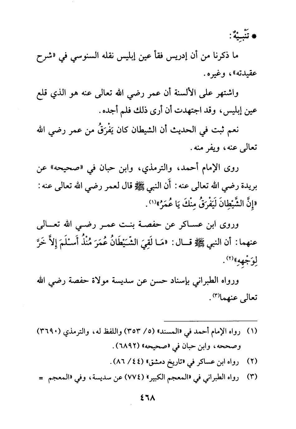روى الإِمام أحمد، والترمذي، وابن حبان في "صحيحه" عن بريدة رضي الله تعالى عنه: أَن النبي - صلى الله عليه وسلم - قال لعمر رضي الله تعالى عنه: "إِنَّ الشَّيْطِانَ لَيَفْرَقُ مِنْكَ يَا عُمَرُ" (¬1).