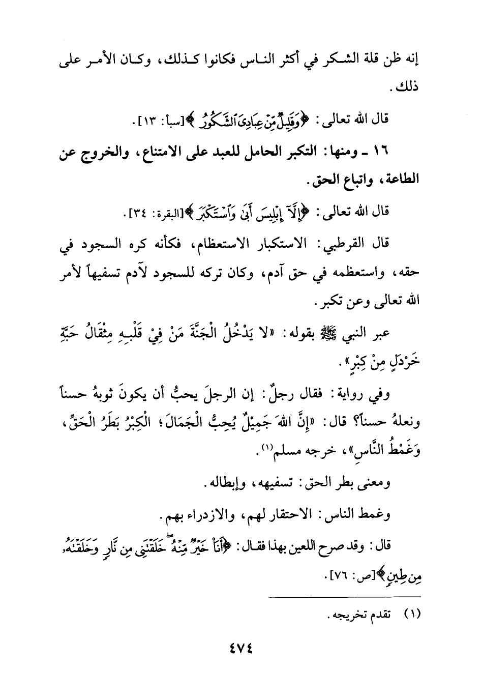 16 - ومنها: التكبر الحامل للعبد على الامتناع، والخروج عن الطاعة، واتباع الحق.