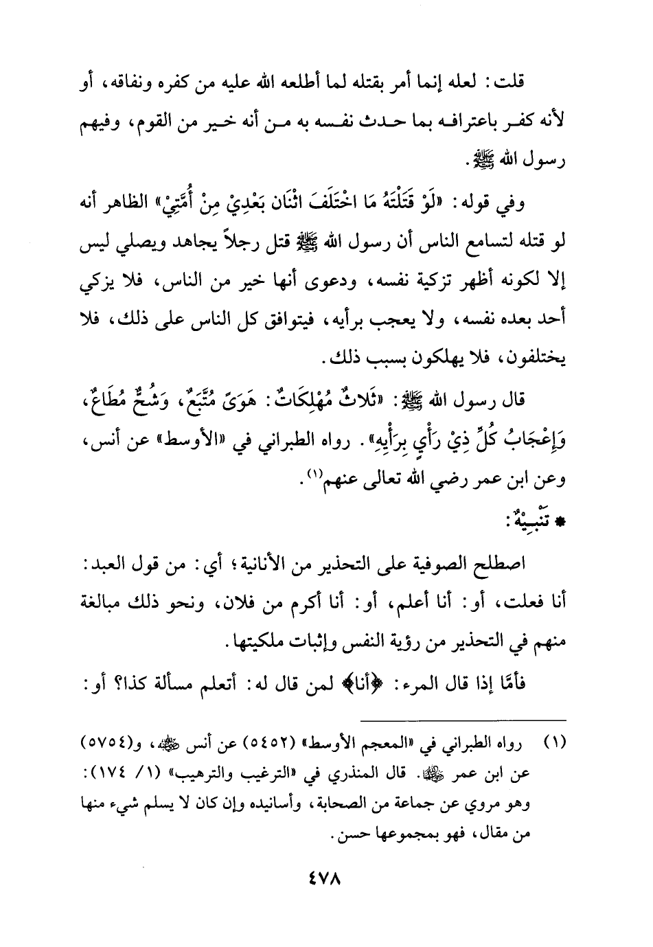 قال رسول الله - صلى الله عليه وسلم -. "ثَلاثٌ مُهْلِكَاتٌ: هَوًى مُتَّبَعٌ، وَشُحٌّ مُطَاعٌ، وإعْجَابُ كُلِّ ذِيْ رَأْيٍ بِرَأْيهِ". رواه الطبراني في "الأوسط" عن أنس، وعن ابن عمر رضي الله تعالى عنهم (¬1).