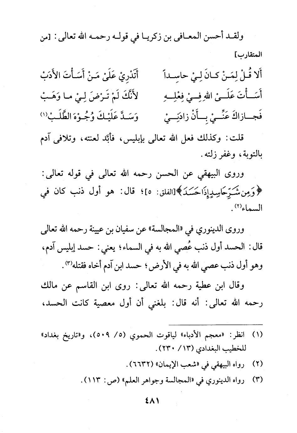 وروى البيهقي عن الحسن رحمه الله تعالى في قوله تعالى: {وَمِنْ شَرِّ حَاسِدٍ إِذَا حَسَدَ} [الفلق: 5]؛ قال: هو أول ذنب كان في السماء (¬2).