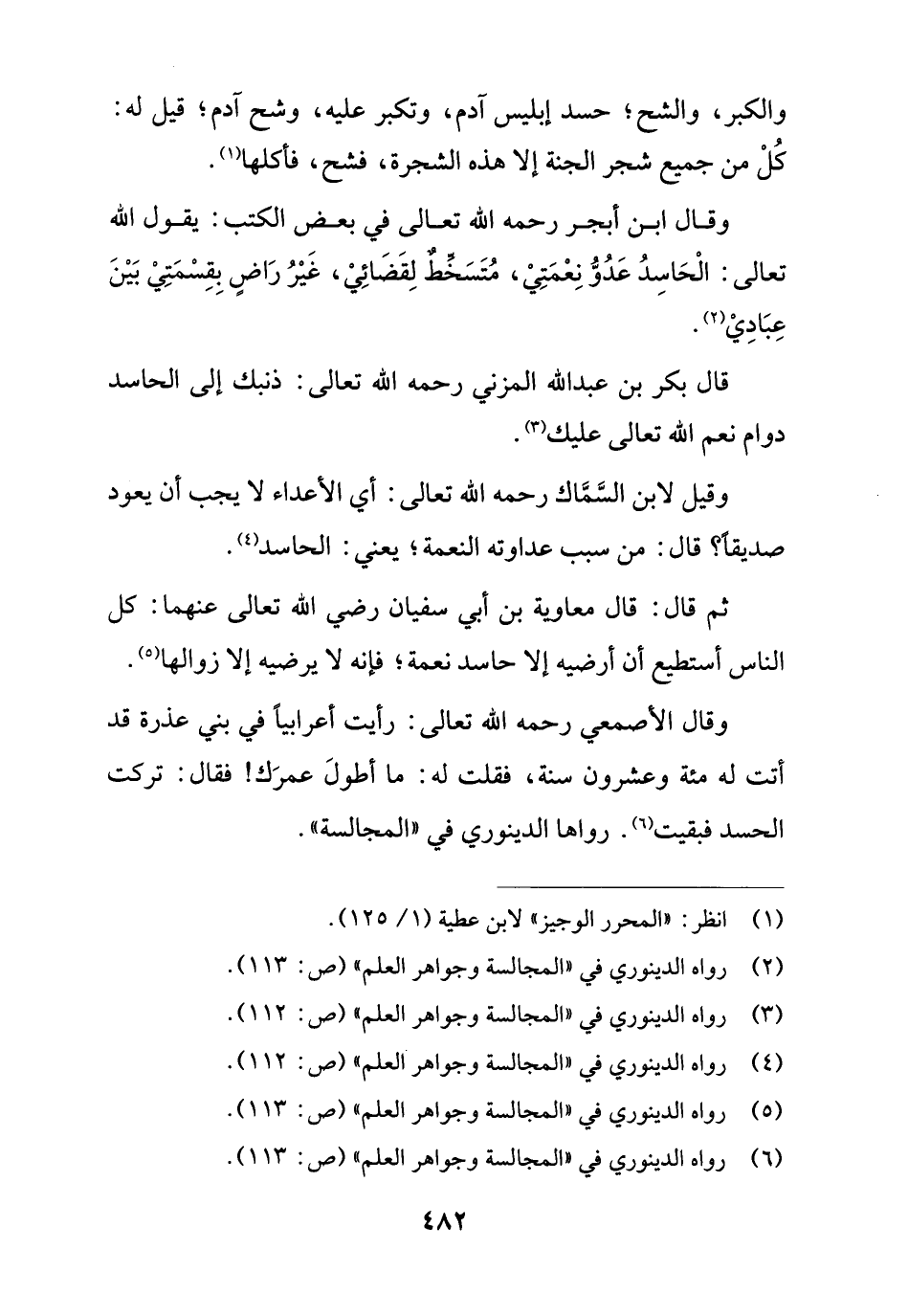 ثم قال: قال معاوية بن أبي سفيان رضي الله تعالى عنهما: كل الناس أستطيع أن أرضيه إلا حاسد نعمة؛ فإنه لا يرضيه إلا زوالها (¬5).