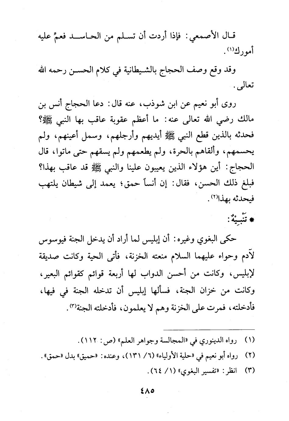 روى أبو نعيم عن ابن شوذب، عنه قال: دعا الحجاج أنس بن مالك رضي الله تعالى عنه: ما أعظم عقوبة عاقب بها النبي - صلى الله عليه وسلم -؟ فحدثه بالذين قطع النبي - صلى الله عليه وسلم - أيديهم وأرجلهم، وسمل أعينهم، ولم يحسمهم، وألقاهم بالحرة، ولم يطعمهم ولم يسقهم حتى ماتوا، قال الحجاج: أين هؤلاء الذين يعيبون علينا والنبي - صلى الله عليه وسلم - قد عاقب بهذا؟ فبلغ ذلك الحسن، فقال: إن أنساً حمق؛ يعمد إلى شيطان يلتهب فيحدثه بهذا (¬2).