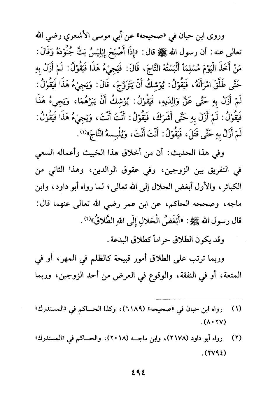 وروى ابن حبان في "صحيحه" عن أبي موسى الأشعري رضي الله تعالى عنه: أن رسول الله - صلى الله عليه وسلم - قال: "إِذَا أَصْبَحَ إِبْلِيْسُ بَثَّ جُنُوْدهُ وَقَالَ: مَنْ أَخَذَ الْيَوْمَ مُسْلِمَا ألبَسْتُهُ التَّاجَ، قَالَ: فَيَجِيْءُ هَذَا فَيقُوْلُ: لَمْ أَزَلْ بِهِ حَتَّى طَلَّقَ امْرَأتهُ، فَيقُوْلُ: يُوْشِكُ أَنْ يتَزَوَّجَ، قَالَ: وَيَجِيْءُ هَذا فَيقُوْلُ: لَمْ أَزَلْ بِهِ حَتَّى عَقَّ وَالِدَيهِ، فَيقُوْلُ: يُوْشِكُ أَنْ يَبَرَّهُمَا، وَيجِيءُ هَذَا فَيقُوْلُ: لَمْ أَزَلْ بِهِ حَتَّى أَشَرَكَ، فَيَقُوْلُ: أَنْتَ أَنْتَ، وَيجِيْءُ هَذَا فَيَقُوْلُ: لَمْ أَزَلْ بِهِ حَتَّى قتَلَ، فَيَقُوْلُ: أَنْتَ أنتَ، وَيُلْبِسهُ التَّاجَ" (¬1).