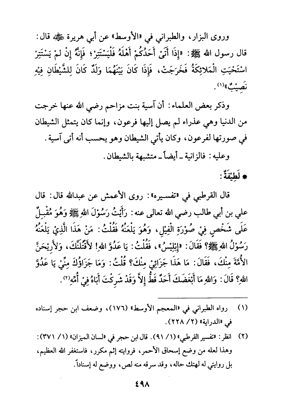 قال القرطبي في "تفسيره": روى الأعمش عن عبد الله قال: قال علي بن أبي طالب رضي الله تعالى عنه: رَأَيْتُ رَسُوْلَ اللهِ - صلى الله عليه وسلم - وَهُوَ مُقْبِل عَلَى شَخْصٍ فِيْ صُوْرَةِ الْفِيْلِ، وَهُوَ يَلْعَنُهُ فَقُلْتُ: مَنْ هَذَا الَّذِيْ يَلْعَنُهُ رَسُوْلُ اللهِ - صلى الله عليه وسلم -؟ فَقَالَ: "إِبْلِيْسُ"، فَقُلْتُ: يَا عَدُوَّ اللهِ! لأَقتلَنَّكَ، وَلأَرِيْحَنَّ الأُمَّةَ مِنْكَ، فَقَالَ: مَا هَذَا جَزَائِيْ مِنْكَ؟ قُلْتُ: وَمَا جَزَاؤُكَ مِنّيْ يَا عَدُوَّ اللهِ؟ قَالَ: وَاللهِ مَا أَبْغَضَكَ أَحَدٌ قَط إلا وَقَدْ شَرِكْتَ أَبَاهُ فِيْ أُمّهِ (¬2).