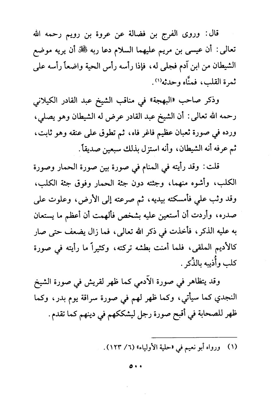 وذكر صاحب "البهجة" في مناقب الشيخ عبد القادر الكيلاني رحمه الله تعالى: أن الشيخ عبد القادر عرض له الشيطان وهو يصلي، ورده في صورة ثعبان عظيم فاغر فاه، ثم تطوق على عنقه وهو ثابت، ثم عرفه أنه الشيطان، وأنه استزل بذلك سبعين صديقًا.