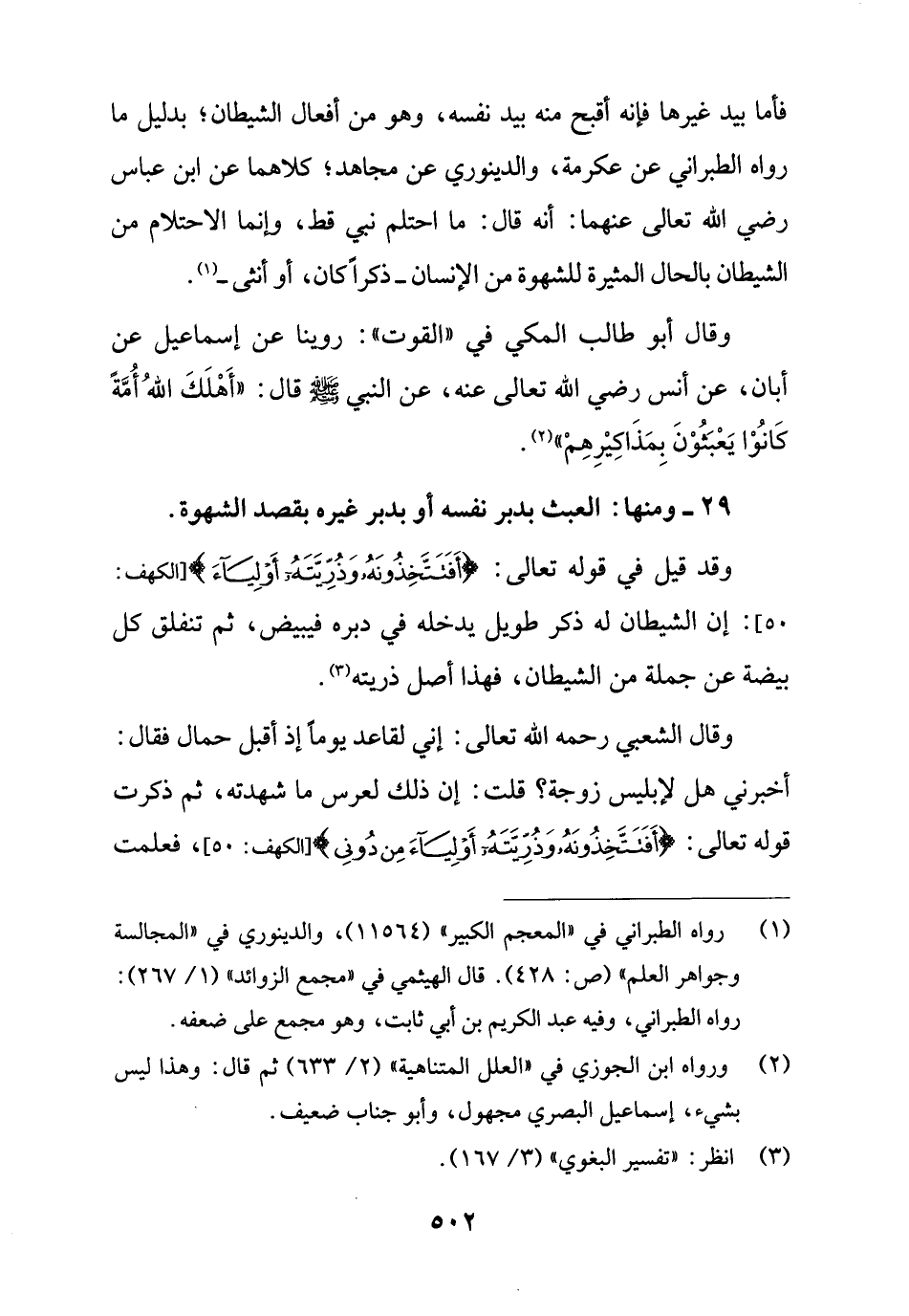 فأما بيد غيرها فإنه أقبح منه بيد نفسه، وهو من أفعال الشيطان؛ بدليل ما رواه الطبراني عن عكرمة، والدينوري عن مجاهد؛ كلاهما عن ابن عباس رضي الله تعالى عنهما: أنه قال: ما احتلم نبي قط، وإنما الاحتلام من الشيطان بالحال المثيرة للشهوة من الإنسان -ذكرًا كان، أو أنثى- (¬1).