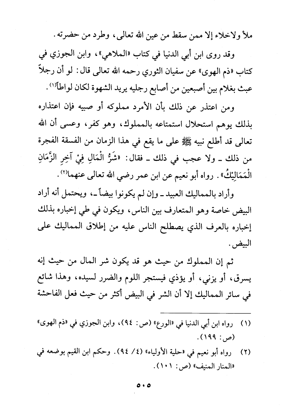 ومن اعتذر عن ذلك بأن الأمرد مملوكه أو صبيه فإن اعتذاره بذلك يوهم استحلال استمتاعه بالمملوك، وهو كفر، وعسى أن الله تعالى قد أطلع نبيه - صلى الله عليه وسلم - على ما يقع في هذا الزمان من الفسقة الفجرة من ذلك -ولا عجيب في ذلك- فقال: "شَرُّ الْمَالِ فِيْ آخِرِ الزَّمَانِ الْمَمَالِيْكُ". رواه أبو نعيم عن ابن عمر رضي الله تعالى عنهما (¬2).