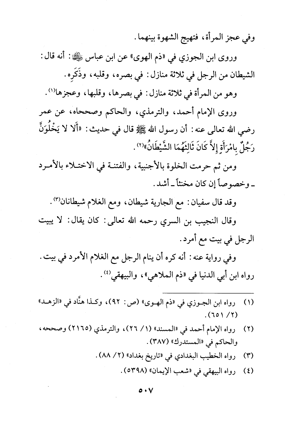 وروى الإِمام أحمد، والترمذي، والحاكم وصححاه، عن عمر رضي الله تعالى عنه: أن رسول الله - صلى الله عليه وسلم - قال في حديث: "أَلا لا يَخْلُوَنَّ رَجُلٌ بِامْرَأَةٍ إِلاَّ كَانَ ثَالِثَهُمَا الشَّيْطَانُ" (¬2).