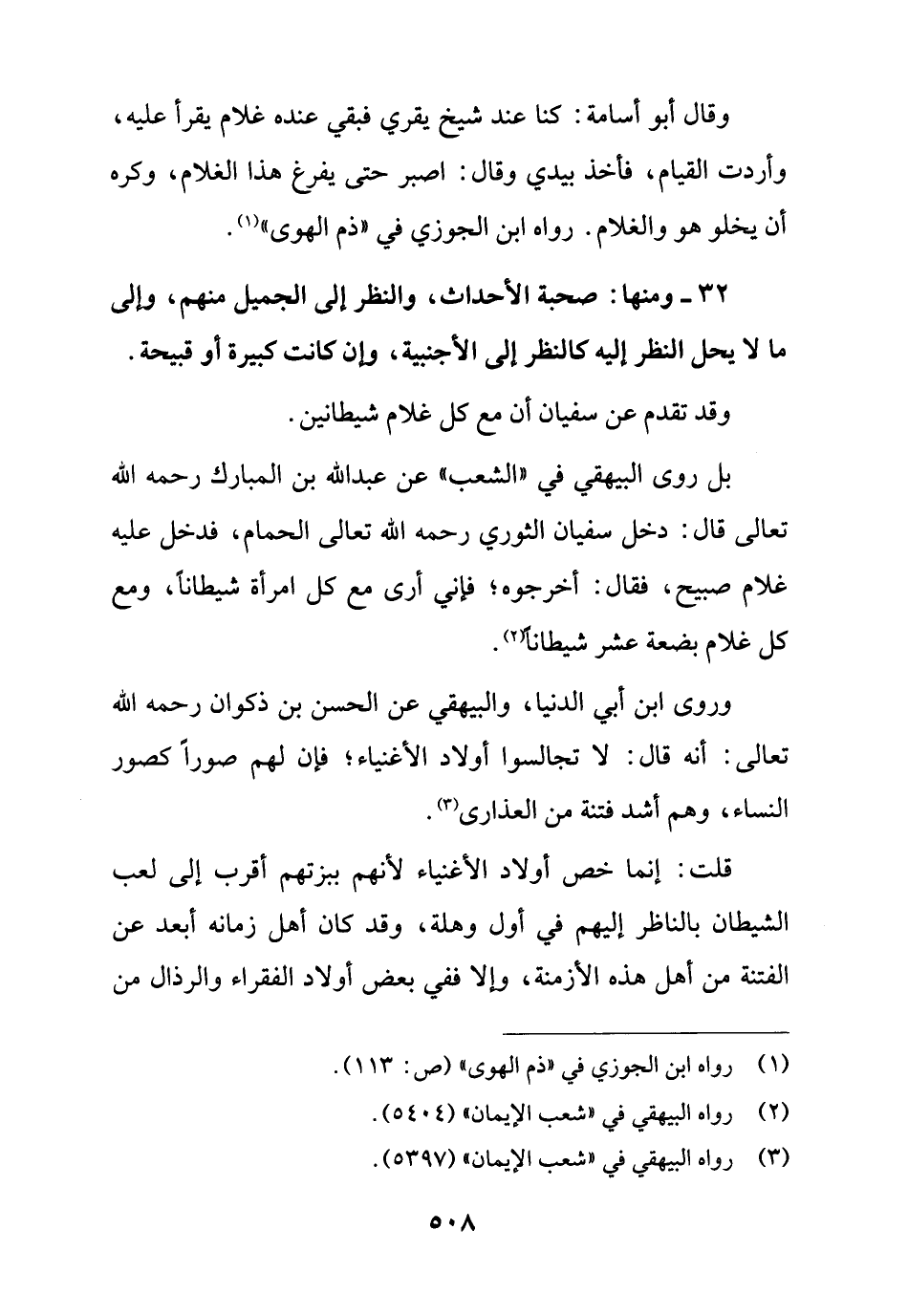 32 - ومنها: صحبة الأحداث، والنظر إلى الجميل منهم، وإلى ما لا يحل النظر إليه كالنظر إلى الأجنبية، وإن كانت كبيرة أو قبيحة.