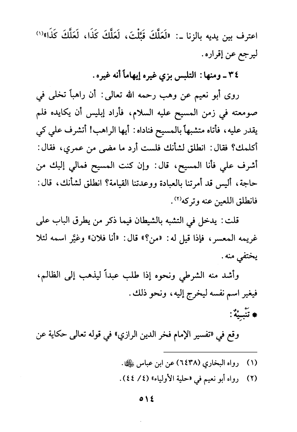 روى أبو نعيم عن وهب رحمه الله تعالى: أن راهباً تخلى في صومعته في زمن المسيح عليه السلام، فأراد إبليس أن يكايده فلم يقدر عليه، فأتاه متشبها بالمسيح فناداه: أيها الراهب! أتشرف علي كي أكلمك؟ فقال: انطلق لشأنك فلست أرد ما مضى من عمري، فقال: أشرف علي فأنا المسيح، قال: وإن كنت المسيح فمالي إليك من حاجة، أليس قد أمرتنا بالعبادة ووعدتنا القيامة؟ انطلق لشأنك، قال: فانطلق اللعين عنه وتركه (¬2).