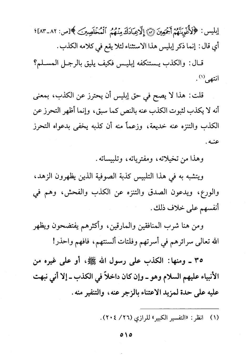 قلت: هذا لا يصح في حق إبليس أن يحترز عن الكذب، بمعنى أنه لا يكذب لثبوت الكذب عنه بالنص كما سبق، وإنما أظهر التحرز عن الكذب والتنزه عنه خديعة، وزعمًا منه أن كذبه يخفى بدعواه التحرز عنه.