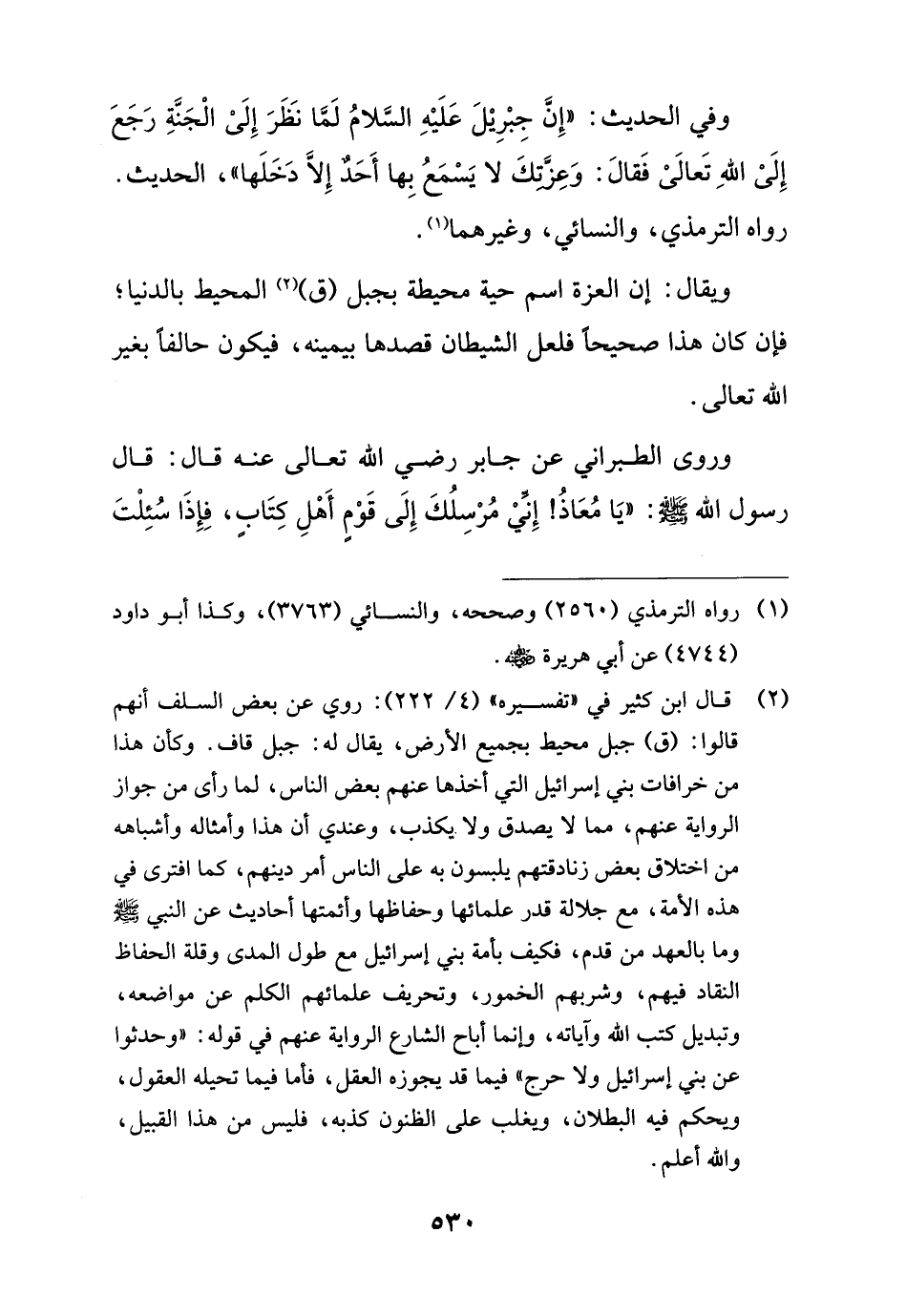 (¬2) قال ابن كثير في "تفسيره" (4/ 222): روي عن بعض السلف أنهم قالوا: (ق) جبل محيط بجميع الأرض، يقال له: جبل قاف. وكأن هذا من خرافات بني إسرائيل التي أخذها عنهم بعض الناس، لما رأى من جواز الرواية عنهم، مما لا يصدق ولا يكذب، وعندي أن هذا وأمثاله وأشباهه من اختلاق بعض زنادقتهم يلبسون به على الناس أمر دينهم، كما افترى في هذه الأمة، مع جلالة قدر علمائها وحفاظها وأئمتها أحاديث عن النبي - صلى الله عليه وسلم - وما بالعهد من قدم، فكيف بأمة بني إسرائيل مع طول المدى وقلة الحفاظ النقاد فيهم، وشربهم الخمور، وتحريف علمائهم الكلم عن مواضعه، وتبديل كتب الله وآياته، وإنما أباح الشارع الرواية عنهم في قوله: "وحدثوا عن بني إسرائيل ولا حرج" فيما قد يجوزه العقل، فأما فيما تحيله العقول، ويحكم فيه البطلان، ويغلب على الظنون كذبه، فليس من هذا القبيل، والله أعلم.