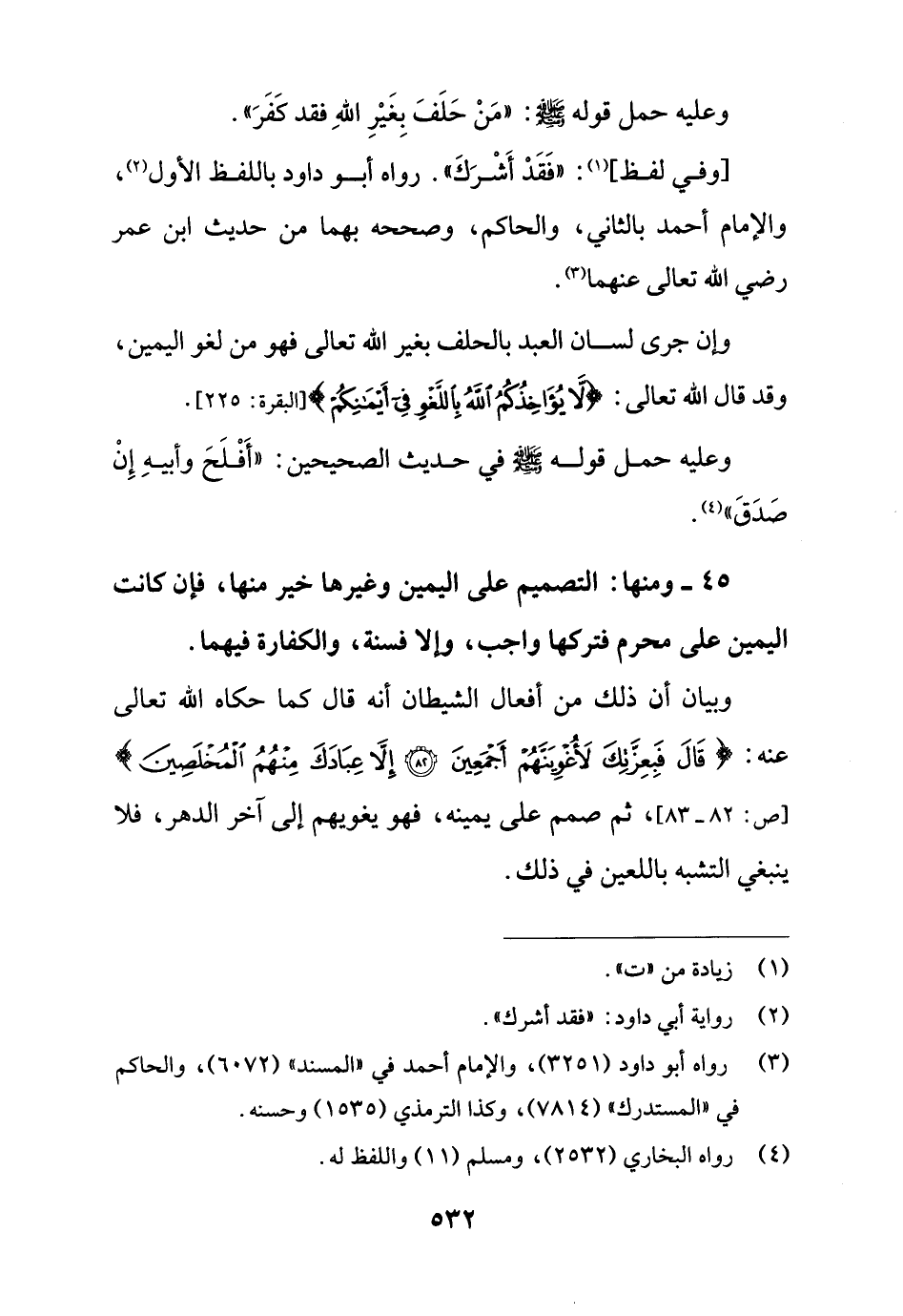 [وفي لفظ] (¬1): "فَقَدْ أَشْرَكَ". رواه أبو داود باللفظ الأول (¬2)، والإمام أحمد بالثاني، والحاكم، وصححه بهما من حديث ابن عمر رضي الله تعالى عنهما (¬3).