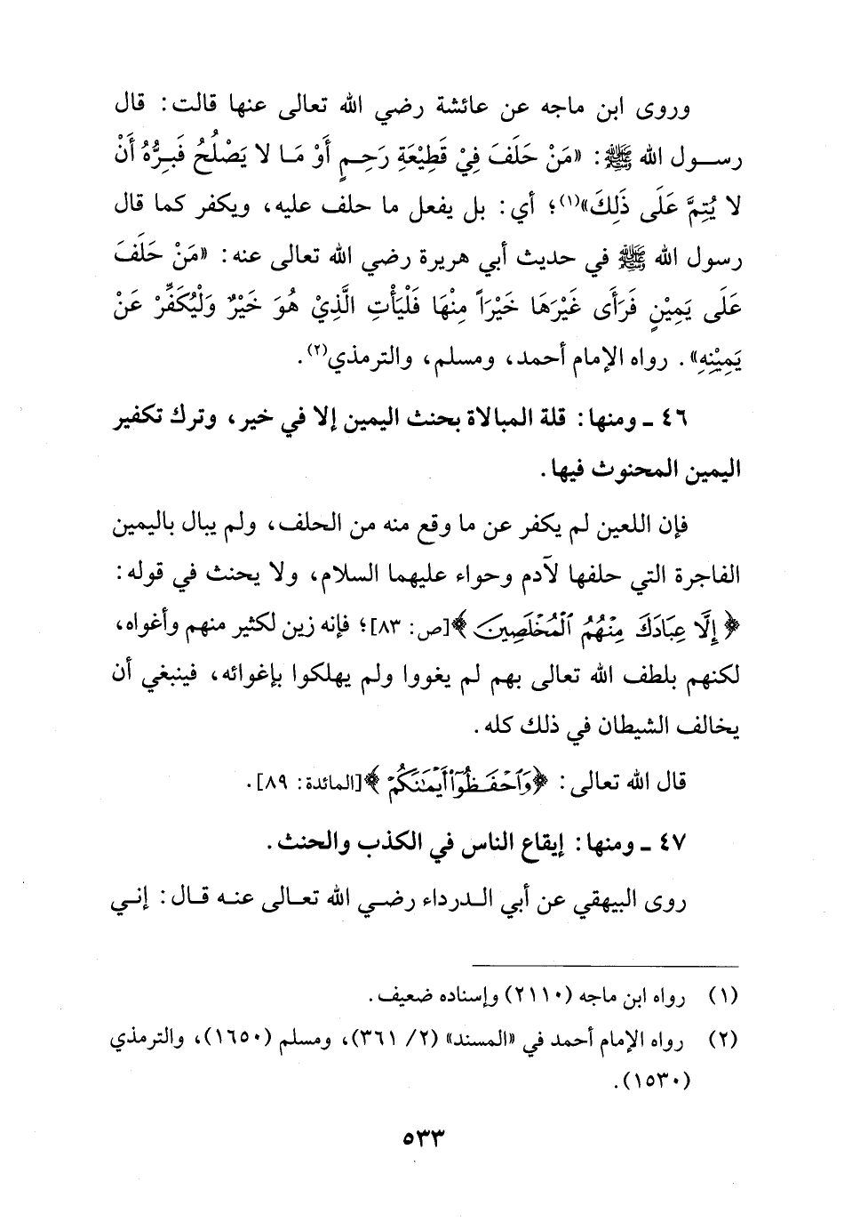 46 - ومنها: قلة المبالاة بحنث اليمين إلا في خير، وترك تكفير اليمين المحنوث فيها.