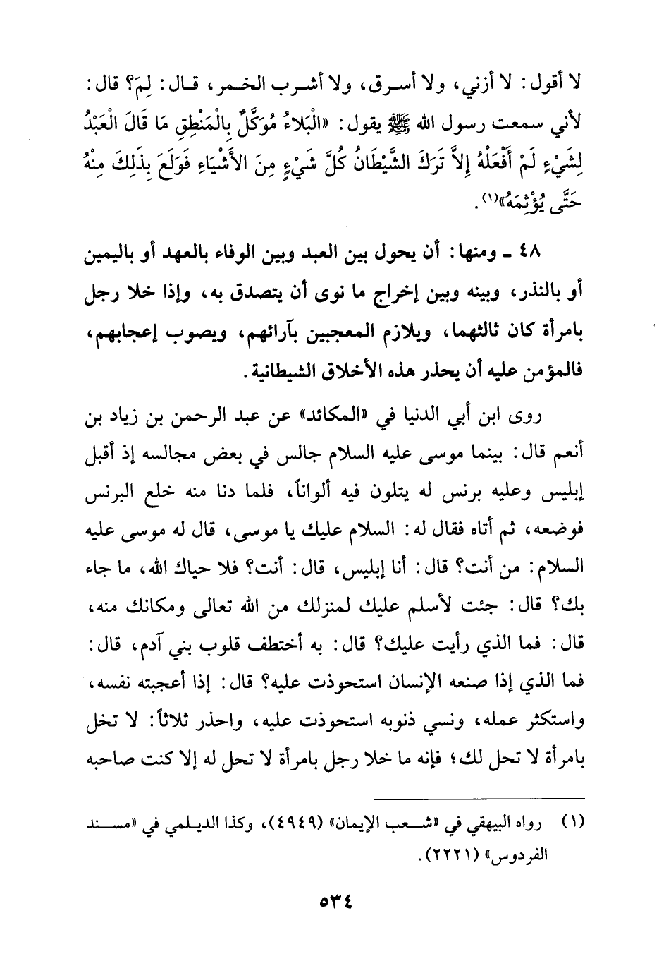 روى ابن أبي الدنيا في "المكائد" عن عبد الرحمن بن زياد بن أنعم قال: بينما موسى عليه السلام جالس في بعض مجالسه إذ أقبل إبليس وعليه برنس له يتلون فيه ألواناً، فلما دنا منه خلع البرنس فوضعه، ثم أتاه فقال له: السلام عليك يا موسى، قال له موسى عليه السلام: من أنت؟ قال: أنا إبليس، قال: أنت؟ فلا حياك الله، ما جاء بك؟ قال: جئت لأسلم عليك لمنزلك من الله تعالى ومكانك منه، قال: فما الذي رأيت عليك؟ قال: به أختطف قلوب بني آدم، قال: فما الذي إذا صنعه الإنسان استحوذت عليه؟ قال: إذا أعجبته نفسه، واستكثر عمله، ونسي ذنوبه استحوذت عليه، واحذر ثلاثاً: لا تخل بامرأة لا تحل لك؛ فإنه ما خلا رجل بامرأة لا تحل له إلا كنت صاحبه