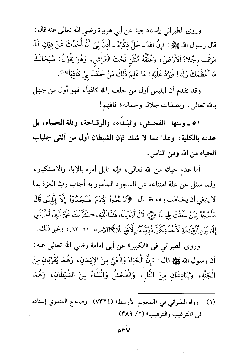 51 - ومنها: الفحش، والبَذَاء، والوقاحة، وقلة الحياء، بل عدمه بالكلية، وهذا مما لا شك فإن الشيطان أول من ألقى جلباب الحياء من الله ومن الناس.