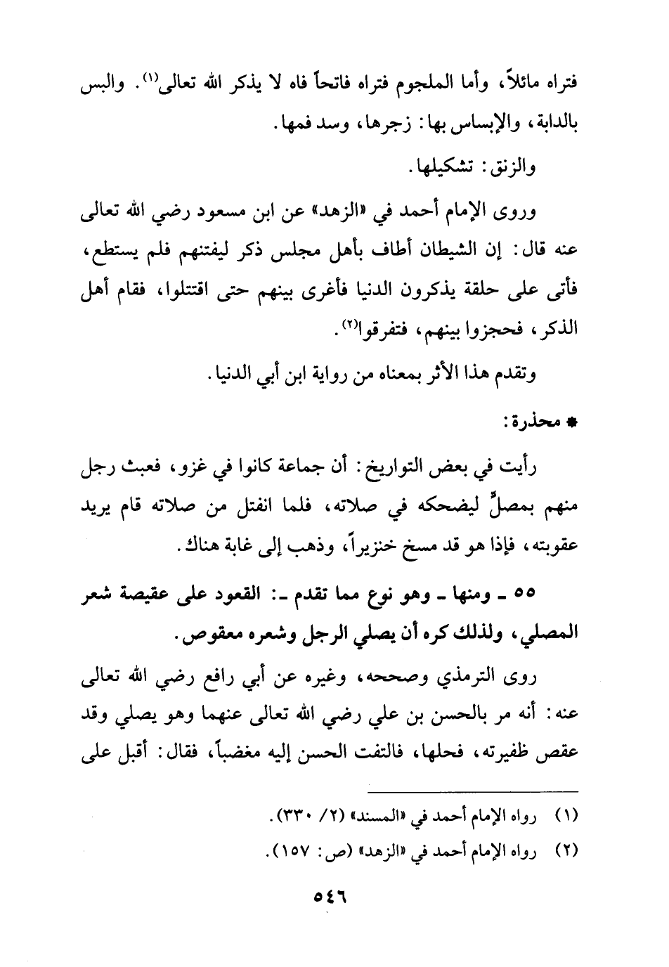 55 - ومنها -وهو نوع مما تقدم-: القعود على عقيصة شعر المصلي، ولذلك كره أن يصلي الرجل وشعره معقوص.