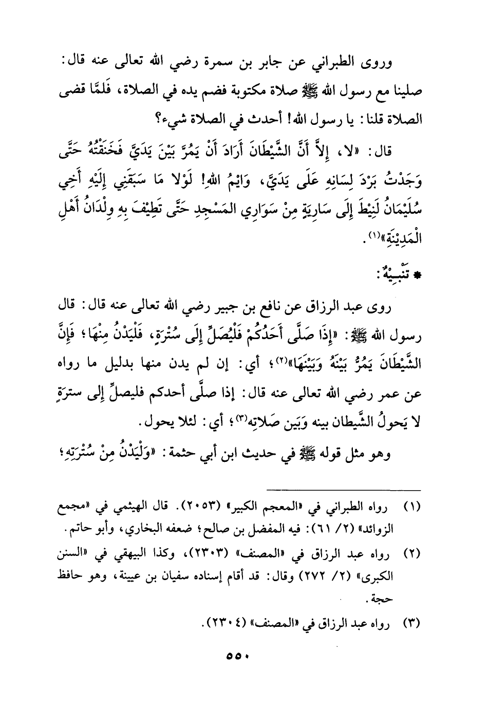 روى عبد الرزاق عن نافع بن جبير رضي الله تعالى عنه قال: قال رسول الله - صلى الله عليه وسلم -: "إِذَا صَلَّى أَحَدُكُمْ فَلْيُصَلِّ إِلَى سُتْرَةٍ، فَلْيَدْنُ مِنْهَا؛ فَإِنَّ الشَّيْطَانَ يَمُرُّ بَيْنَهُ وَبَيْنَهَا" (¬2)؛ أي: إن لم يدن منها بدليل ما رواه عن عمر رضي الله تعالى عنه قال: إذا صلَّى أحدكم فليصلِّ إِلى سترَةٍ لا يَحولُ الشَّيطان بينه وَبَين صَلاتِه (¬3)؛ أي: لئلا يحول.