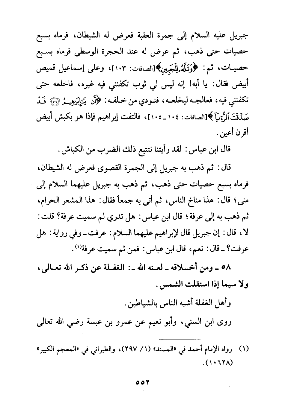 قال: ثم ذهب به جبريل إلى الجمرة القصوى فعرض له الشيطان، فرماه بسبع حصيات حتى ذهب، ثم ذهب به جبريل عليهما السلام إلى منى؛ قال: هذا مناخ الناس، ثم أتى به جمعاً فقال: هذا المشعر الحرام، ثم ذهب به إلى عرفة؛ قال ابن عباس: هل تدري لم سميت عرفة؟ قلت: لا، قال: إن جبريل قال لإبراهيم عليهما السلام: عرفت -وفي رواية: هل عرفت؟ - قال: نعم، قال ابن عباس: فمن ثم سميت عرفة (¬1).
